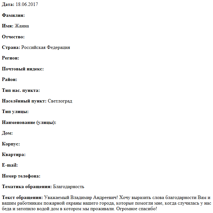 Уважаемый Владимир Андреевич! Хочу выразить слова благодарности Вам и вашим работникам пожарной охраны нашего города, которые помогли мне, когда случилась у нас беда и затопило водой дом в котором мы проживали. Огромное спасибо!