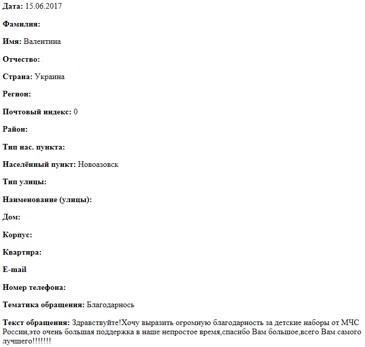 Здравствуйте! Хочу выразить огромную благодарность за детские наборы от МЧС России,это очень большая поддержка в наше непростое время,спасибо Вам большое,всего Вам самого лучшего!!!!!!!