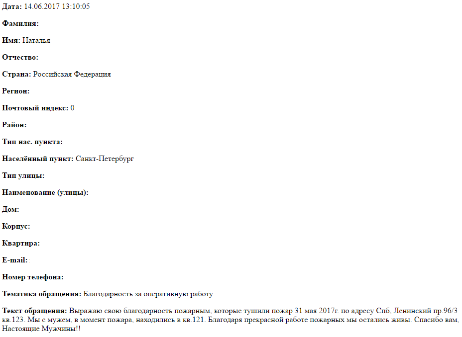 Выражаю свою благодарность пожарным, которые тушили пожар 31 мая 2017г. по адресу Спб, Ленинский пр.96/3 кв.123. Мы с мужем, в момент пожара, находились в кв.121. Благодаря прекрасной работе пожарных мы остались живы. Спасибо вам, Настоящие Мужчины!!
