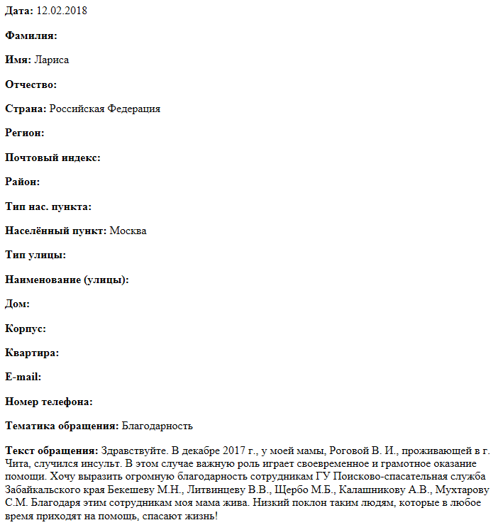 Здравствуйте. В декабре 2017 г., у моей мамы, Роговой В. И., проживающей в г. Чита, случился инсульт. В этом случае важную роль играет своевременное и грамотное оказание помощи. Хочу выразить огромную благодарность сотрудникам ГУ Поисково-спасательная служба Забайкальского края Бекешеву М.Н., Литвинцеву В.В., Щербо М.Б., Калашникову А.В., Мухтарову С.М. Благодаря этим сотрудникам моя мама жива. Низкий поклон таким людям, которые в любое время приходят на помощь, спасают жизнь!