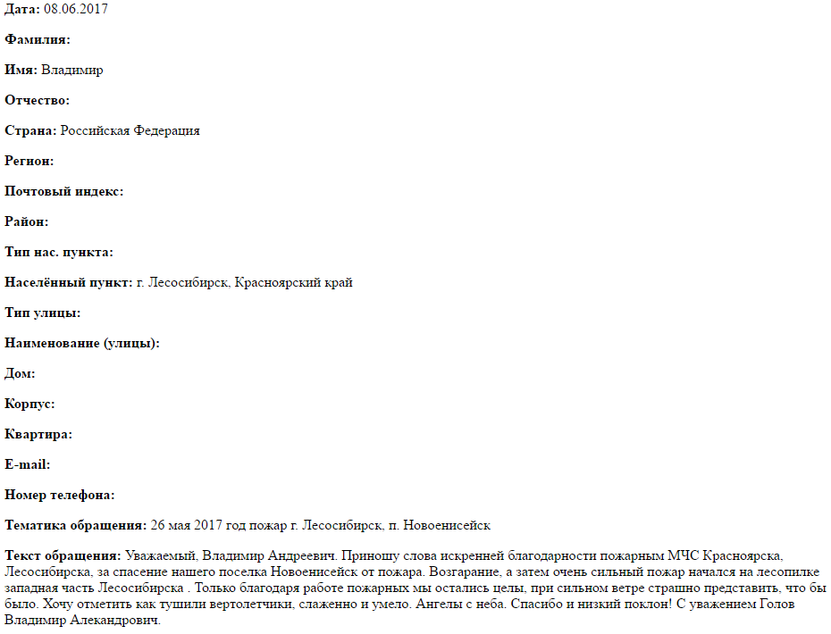 Уважаемый, Владимир Андреевич. Приношу слова искренней благодарности пожарным МЧС Красноярска, Лесосибирска, за спасение нашего поселка Новоенисейск от пожара. Возгарание, а затем очень сильный пожар начался на лесопилке западная часть Лесосибирска . Только благодаря работе пожарных мы остались целы, при сильном ветре страшно представить, что бы было. Хочу отметить как тушили вертолетчики, слаженно и умело. Ангелы с неба. Спасибо и низкий поклон! С уважением Голов Владимир Алекандрович.
