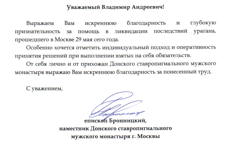 Уважаемый Владимир Андреевич! Выражаем Вам искреннюю благодарность и глубокую признательность за помощь в ликвидации последствий урагана, прошедшего в Москве 29 мая сего года. Особенно хочется отметить индивидуальный подход и оперативность принятия решений при выполнении взятых на себя обязательств. От себя лично и от прихожан Донского ставропигиального мужского монастыря выражаю Вам искреннюю благодарность за понесенный труд.