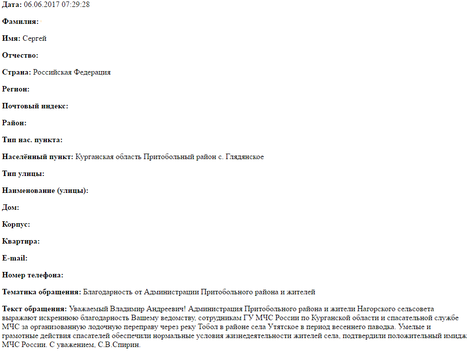 Уважаемый Владимир Андреевич! Администрация Притобольного района и жители Нагорского сельсовета выражают искреннюю благодарность Вашему ведомству, сотрудникам ГУ МЧС России по Курганской области и спасательной службе МЧС за организованную лодочную переправу через реку Тобол в районе села Утятское в период весеннего паводка. Умелые и грамотные действия спасателей обеспечили нормальные условия жизнедеятельности жителей села, подтвердили положительный имидж МЧС России. С уважением, С.В.Спирин.