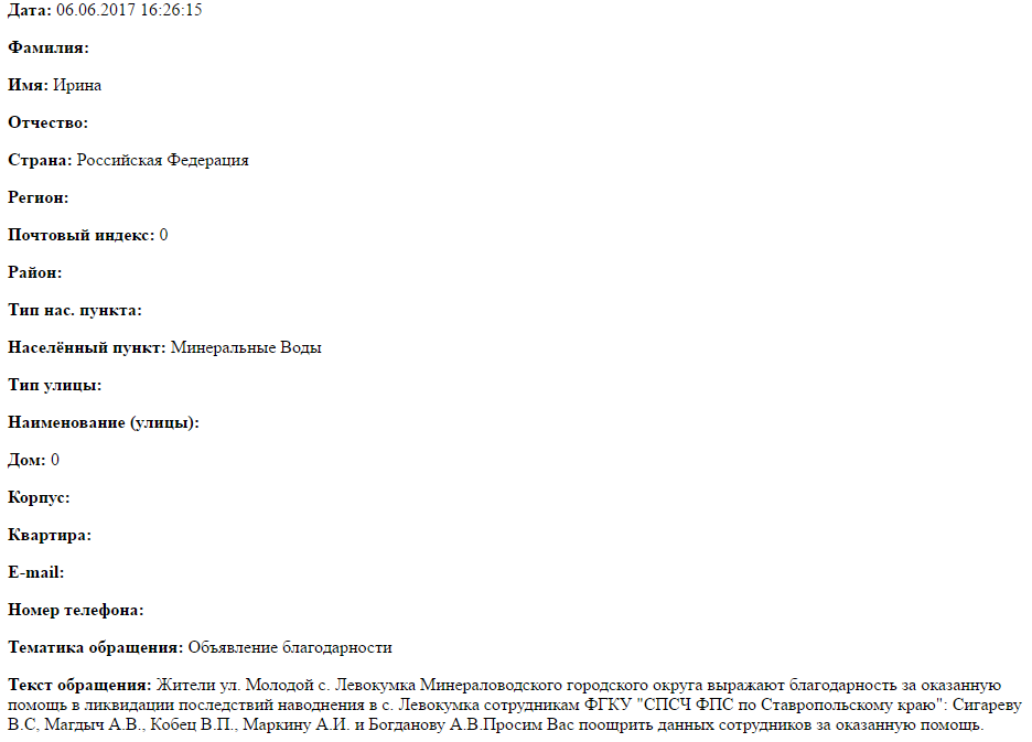 Жители ул. Молодой с. Левокумка Минераловодского городского округа выражают благодарность за оказанную помощь в ликвидации последствий наводнения в с. Левокумка сотрудникам ФГКУ "СПСЧ ФПС по Ставропольскому краю": Сигареву В.С, Магдыч А.В., Кобец В.П., Маркину А.И. и Богданову А.В.Просим Вас поощрить данных сотрудников за оказанную помощь.