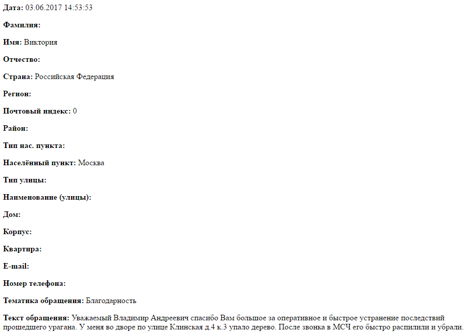Уважаемый Владимир Андреевич спасибо Вам большое за оперативное и быстрое устранение последствий прошедшего урагана. У меня во дворе по улице Клинская д.4 к.3 упало дерево. После звонка в МСЧ его быстро распилили и убрали.