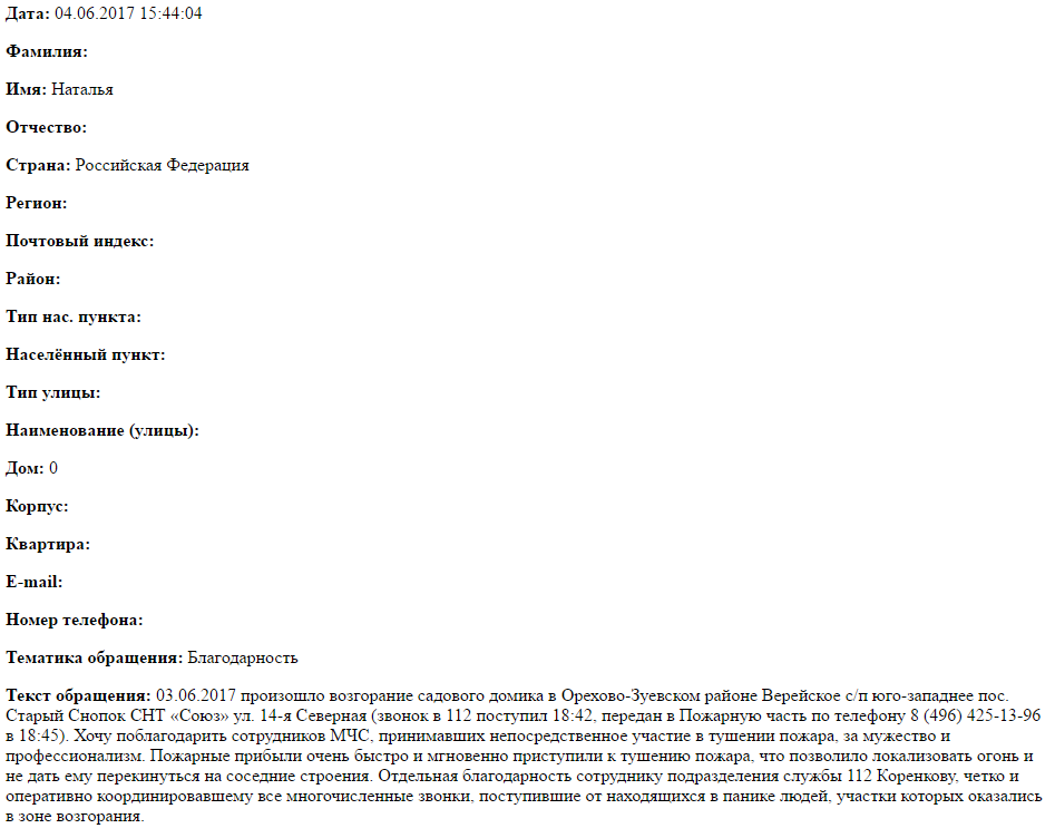 03.06.2017 произошло возгорание садового домика в Орехово-Зуевском районе Верейское с/п юго-западнее пос. Старый Снопок СНТ «Союз» ул. 14-я Северная (звонок в 112 поступил 18:42, передан в Пожарную часть по телефону 8 (496) 425-13-96 в 18:45). Хочу поблагодарить сотрудников МЧС, принимавших непосредственное участие в тушении пожара, за мужество и профессионализм. Пожарные прибыли очень быстро и мгновенно приступили к тушению пожара, что позволило локализовать огонь и не дать ему перекинуться на соседние строения. Отдельная благодарность сотруднику подразделения службы 112 Коренкову, четко и оперативно координировавшему все многочисленные звонки, поступившие от находящихся в панике людей, участки которых оказались в зоне возгорания.