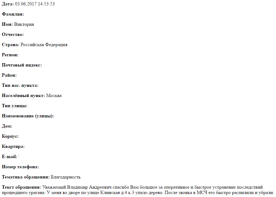 Уважаемый Владимир Андреевич спасибо Вам большое за оперативное и быстрое устранение последствий прошедшего урагана. У меня во дворе по улице Клинская д.4 к.3 упало дерево. После звонка в МЧС его быстро распилили и убрали.