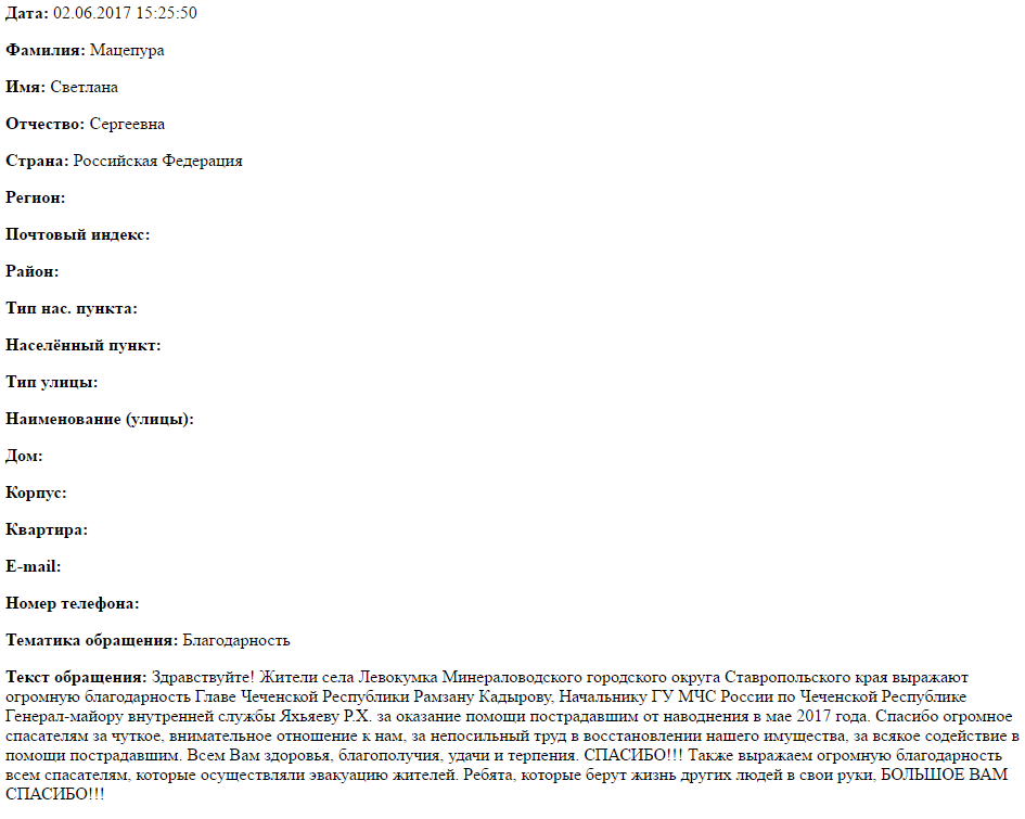 Здравствуйте! Жители села Левокумка Минераловодского городского округа Ставропольского края выражают огромную благодарность Главе Чеченской Республики Рамзану Кадырову, Начальнику ГУ МЧС России по Чеченской Республике Генерал-майору внутренней службы Яхьяеву Р.Х. за оказание помощи пострадавшим от наводнения в мае 2017 года. Спасибо огромное спасателям за чуткое, внимательное отношение к нам, за непосильный труд в восстановлении нашего имущества, за всякое содействие в помощи пострадавшим. Всем Вам здоровья, благополучия, удачи и терпения. СПАСИБО!!! Также выражаем огромную благодарность всем спасателям, которые осуществляли эвакуацию жителей. Ребята, которые берут жизнь других людей в свои руки, БОЛЬШОЕ ВАМ СПАСИБО!!!