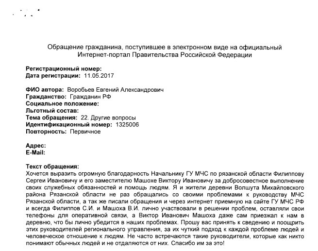 Хочется выразить огромную благодарность Начальнику ГУ МЧС по рязанской области Филиппову Сергей Ивановичу и его заместителю Машохе Виктору Ивановичу за добросовестное выполнение своих служебных обязанностей и помощь людям. Я и жители деревни Волшута Михайловского районе Рязанской области не раз обращались со своими проблемами к руководству МЧС Рязанской области, а так же писали обращения и через интернет приемную на сайте ГУ МЧС РФ и всегда Филиппов С.И. и Машоха В.И. лично участвовали в решении проблем. оставляли свои телефоны для оперативной связи. а Виктор Иванович Машоха даже сам приезжал к нам в деревню, что бы лично убедится в наших проблемах. Прошу вас принять к сведению и поощрить этих руководителей регионального управления, за их чуткий подход к каждой проблеме людей и человеческое отношение к людям, Не часто встречаются такие руководители. которые как никто понимают обычных людей и не отдаляются от них. Спасибо им за это!