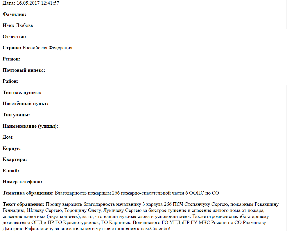 Прошу выразить благодарность начальнику 3 караула 266 ПСЧ Степанчуку Сергею, пожарным Ревакшину Геннадию, Шляеву Сергею, Торощину Олегу, Лукичеву Сергею за быстрое тушение и спасение жилого дома от пожара, спасение животных (двух кошечек), за то, что нашли нужные слова и успокоили меня. Также огромное спасибо старшему дознавателю ОНД и ПР ГО Краснотурьинск, ГО Карпинск, Волчанского ГО УНДиПР ГУ МЧС России по СО Рахманову Дмитрию Рафаиловичу за внимательное и чуткое отношение к нам.Спасибо!