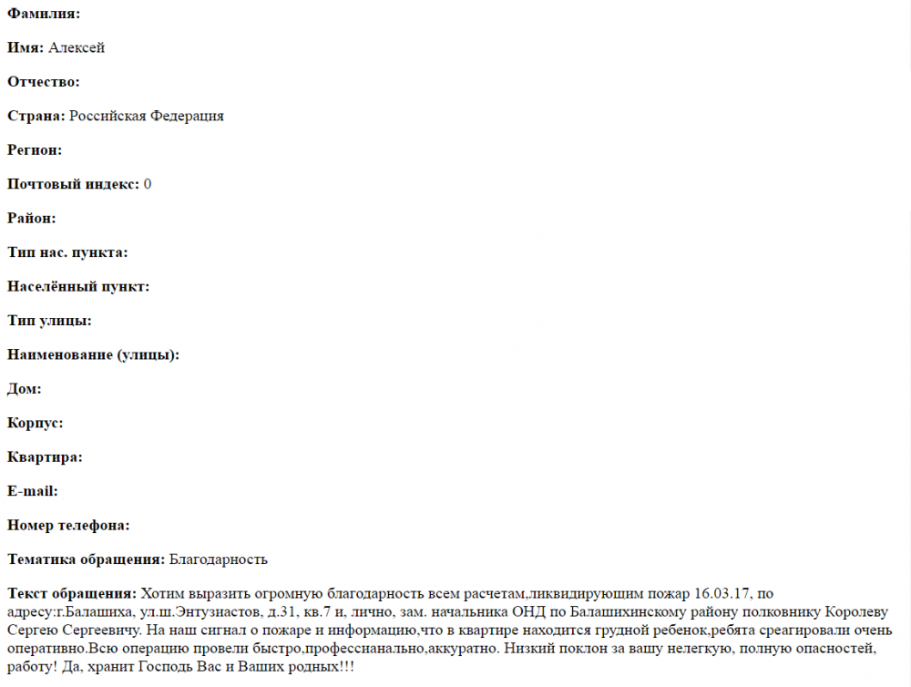 Хотим выразить огромную благодарность всем расчетам,ликвидирующим пожар 16.03.17, по адресу:г.Балашиха, ул.ш.Энтузиастов, д.31, кв.7 и, лично, зам. начальника ОНД по Балашихинскому району полковнику Королеву Сергею Сергеевичу. На наш сигнал о пожаре и информацию,что в квартире находится грудной ребенок,ребята среагировали очень оперативно.Всю операцию провели быстро,профессианально,аккуратно. Низкий поклон за вашу нелегкую, полную опасностей, работу! Да, хранит Господь Вас и Ваших родных!!!