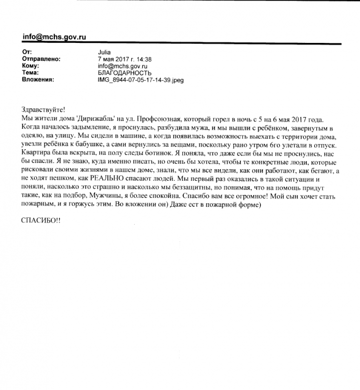Мы жители дома 'Дирижабль' на ул. Профсоюзная, который горел в ночь с 5 на 6 мая 2017 года. Когда началось задымление, я проснулась, разбудила мужа, и мы вышли с ребёнком, завернутым в одеяло, на улицу. Мы сидели в машине, а когда появилась возможность выехать с территории дома, увезли ребёнка к бабушке, а сами вернулись за вещами, поскольку рано утром 6 го улетали в отпуск. Квартира была вскрыта, на полу следы ботинок. Я поняла, что даже если бы мы не проснулись, нас бы спасли. Я не знаю, куда именно писать, по очень бы хотела, чтобы те конкретные люди, которые рисковали своими жизнями в нашем доме, знали, что мы все видели, как они работают, как бегают, а не ходят пешком, как РЕАЛЬНО спасают людей. Мы первый раз оказались в такой ситуации и поняли, насколько это страшно и насколько мы беззащитны, но понимая, что на помощь придут такие, как на подбор, Мужчины, я более спокойна. Спасибо вам все огромное! Мой сын хочет стать пожарным, и я горжусь этим. Во вложении он) Даже ест в пожарной форме)