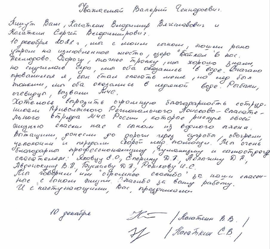 В адрес Главного управления МЧС России по Нижегородской области поступило обращение со словами благодарности спасателям Приволжского регионального поисково-спасательного отряда от рыбаков, которые едва не погибли в ледяной воде. «Уважаемый Валерий Геннадьевич! Пишут Вам Касаткин Владимир Вячеславович и Касаткин Сергей Владимирович. 10 декабря 2021 г. Мы с моим сыном пошли рано утром на излюбленное место – озеро «Байкал» в поселке Неклюдово. Дорогу, точнее тропу, мы хорошо знаем, но случилась беда. Мы оба оказались в воде. Сначала провалился я, а сын стал спасать меня, но лед был тонким и мы оба оказались в ледяной воде. Рыбаки – очевидцы вызвали МЧС. Хотелось выразить огромную благодарность сотрудникам Приволжского регионального поисково-спасательного отряда МЧС России, которые, рискуя своей жизнью, стали спасать нас с сыном из водного плена. Вытащили, донесли до дороги через сугробы, обогрели, успокоили и передали скорой медицинской помощи. Мы очень благодарны профессионализму, гуманизму и самоотдаче спасателей: Е.О. Яковца, Д.А. Еперина, Д.А. Аблыгина, В.П. Авдонькина, Д.А. Буслаева, И.С. Рожкова. Мы говорим им огромное спасибо за наши спасенные с сыном жизни. Спасибо за вашу работу и с наступающими вас праздниками!»