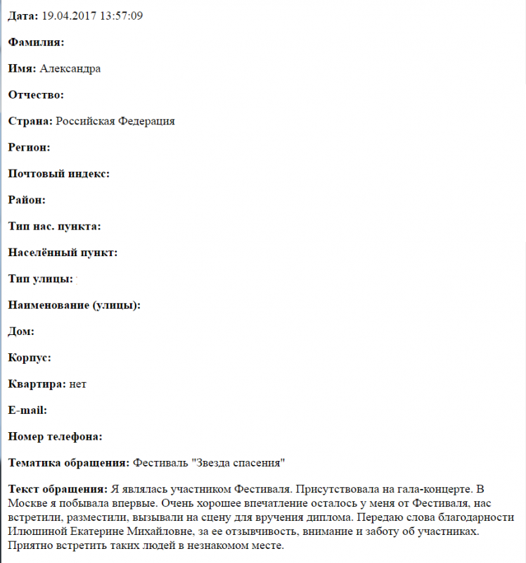 Я являлась участником Фестиваля. Присутствовала на гала-концерте. В Москве я побывала впервые. Очень хорошее впечатление осталось у меня от Фестиваля, нас встретили, разместили, вызывали на сцену для вручения диплома. Передаю слова благодарности Илюшиной Екатерине Михайловне, за ее отзывчивость, внимание и заботу об участниках. Приятно встретить таких людей в незнакомом месте.