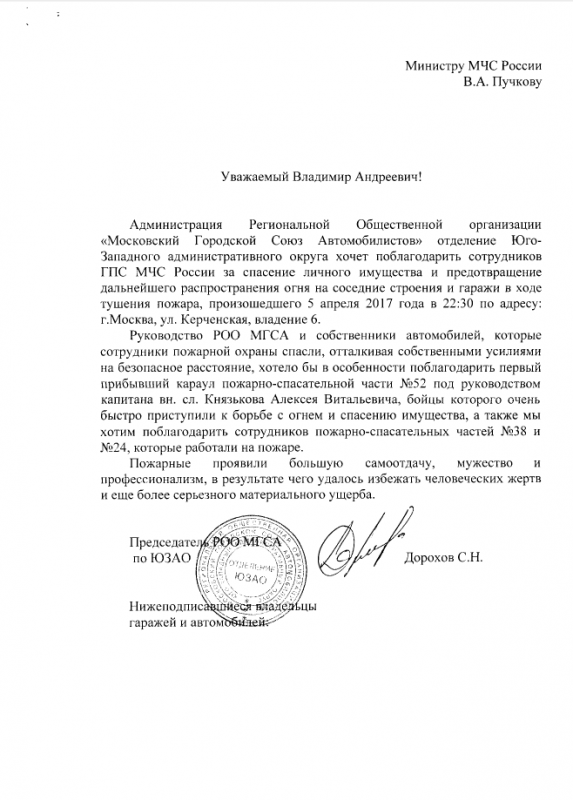 Благодарность сотрудникам ГПС МЧС России от "Московского Городского Союза Автомобилистов"