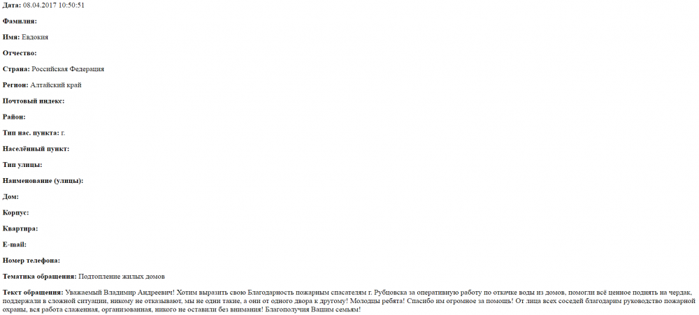 Уважаемый Владимир Андреевич! Хотим выразить свою Благодарность пожарным спасателям г. Рубцовска за оперативную работу по откачке воды из домов, помогли всё ценное поднять на чердак, поддержали в сложной ситуации, никому не отказывают, мы не одни такие, а они от одного двора к другому! Молодцы ребята! Спасибо им огромное за помощь! От лица всех соседей благодарим руководство пожарной охраны, вся работа слаженная, организованная, никого не оставили без внимания! Благополучия Вашим семьям!