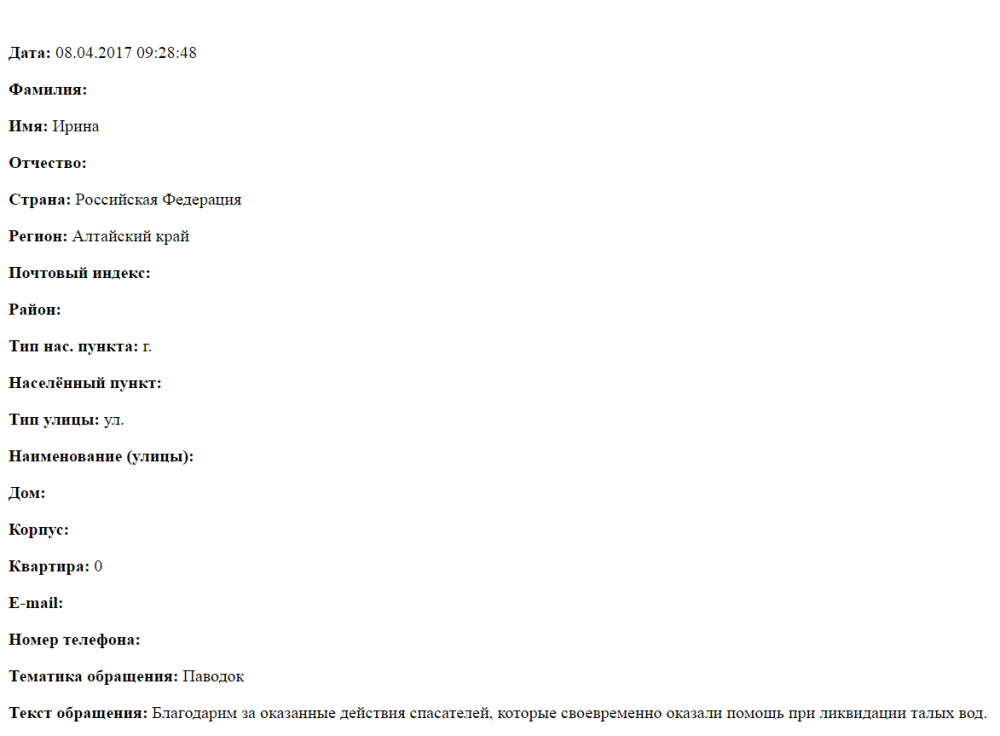 Благодарность спасателям за своевременное оказание помощи при ликвидации талых вод