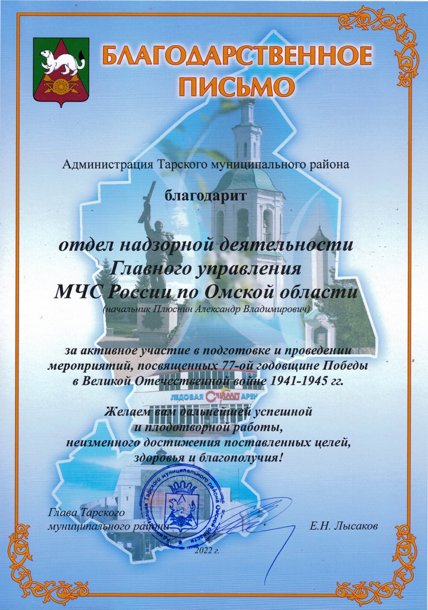 Администрация Тарского муниципального района благодарит территориальный отдел надзорной деятельности и профилактической работы по Тарскому району УНДиПР Главного управления МЧС России по Омской области за активное участие в подготовке и проведении мероприятий, посвященных 77-ой годовщине Победы в Великой Отечественной войне 1941 - 1945г.г. Желаем Вам дальнейшей успешной и плодотворной работы, неизменного достижения поставленных целей, здоровья и благополучия!