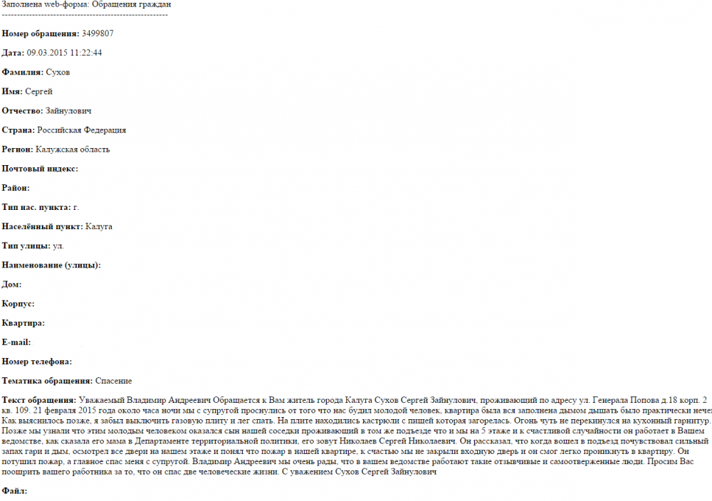 Обращается к Вам житель города Калуга Сухов Сергей Зайнулович, проживающий по адресу ул. Генерала Попова д.18 корп. 2 кв. 109. 21 февраля 2015 года около часа ночи мы с супругой проснулись от того, что нас разбудил молодой человек, квартира была вся заполнена дымом дышать было практически нечем. Как выяснилось позже, я забыл выключить газовую плиту и лег спать. На плите находились кастрюли с пищей, которая загорелась. Огонь чуть не перекинулся на кухонный гарнитур. Позже мы узнали, что этим молодым человеком оказался сын нашей соседки, проживающий в том же подъезде, что и мы на 5 этаже. К счастливой случайности он работает в вашем ведомстве, как сказала его мама в Департаменте территориальной политики, его зовут Николаев Сергей Николаевич. Он рассказал, что когда вошел в подъезд почувствовал сильный запах гари и дым, осмотрел все двери на нашем этаже и понял что пожар в нашей квартире. К счастью мы не закрыли входную дверь и он смог легко проникнуть в квартиру. Он потушил пожар, а главное спас меня с супругой.