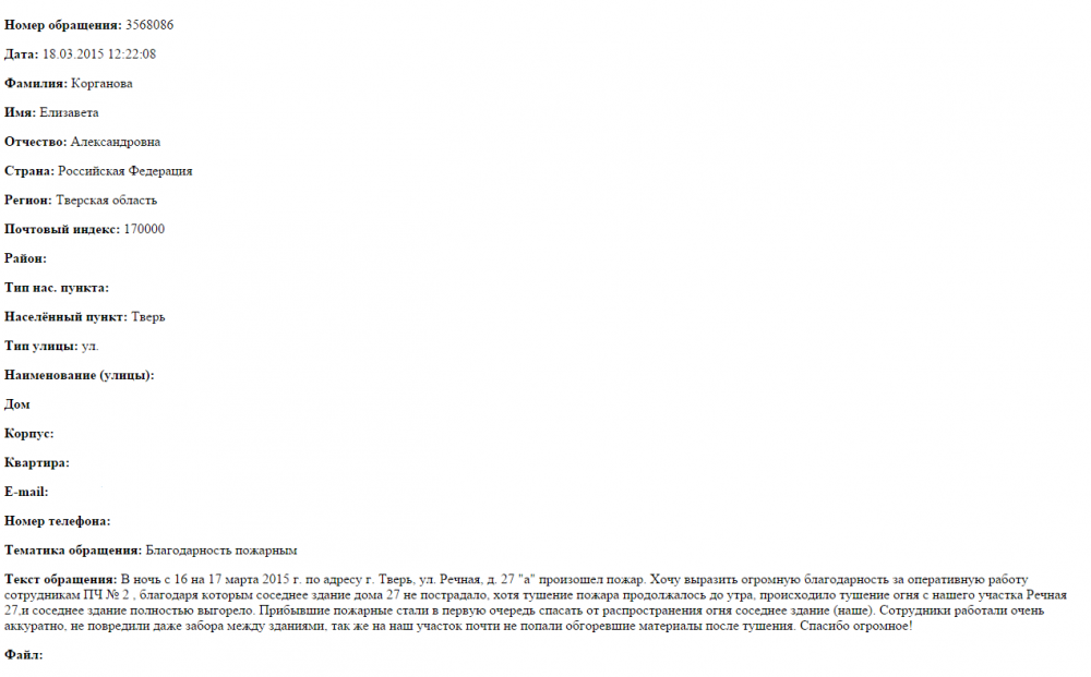 Благодарственные слова сотрудникам пожарной части №2 г. Твери за оперативность и профессионализм