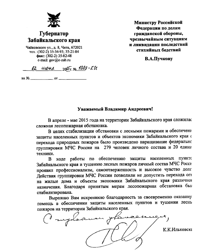 Выражаю Вам искреннюю благодарность за своевременно оказанную помощь в обеспечении защиты населенных пунктов и тушении лесных пожаров на территории Забайкальского края.