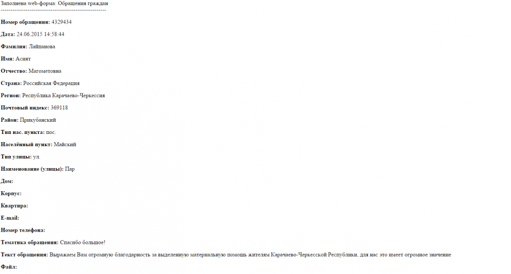 Выражаем Вам огромную благодарность за выделенную материальную помощь жителям Карачаево-Черкесской Республики, для нас это имеет огромное значение