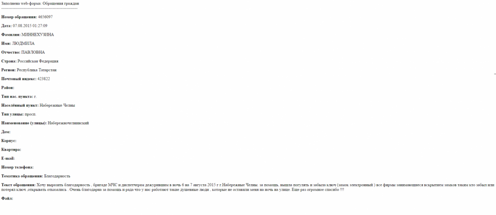 Хочу выразить благодарность бригаде МЧС и диспетчерам дежурившим в ночь 6 на 7 августа 2015 г.Набережные Челны за помощь. Вышла из дома и забыла ключ (замок электронный ). Все фирмы занимающиеся вскрытием замков таким кто забыл или потерял ключ открывать отказались. Очень благодарна за помощь и рада, что у нас работают такие душевные люди , которые не оставили меня на ночь на улице. Еще раз огромное спасибо !!!