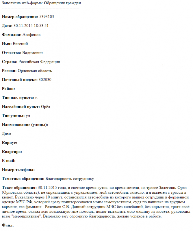 30.11.2015 года, в светлое время суток, во время метели, на трассе Залегощь-Орел (Орловская область), не справившись с управлением, мой автомобиль занесло, и я вылетел с трассы в кювет. Буквально через 10 минут, остановился автомобиль из которого вышел сотрудник в форменной одежде МЧС РФ, который сразу поинтересовался моим самочувствием, судя по нашивке на грудном кармане, его фамилия - Разенков С.В. Данный сотрудник МЧС без колебаний, бескорыстно, тратя своё личное время, оказал всю возможную мне помощь, помог вытащить мою машину из кювета, руководил всем "мероприятием". Выражаю ему огромную благодарность, желаю успехов в работе.