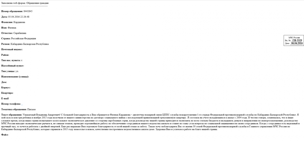 Уважаемый Владимир Андреевич! С большой благодарность к Вам обращается Фатима Карданова – диспетчер пожарной связи ЦППС службы пожаротушения 1-го отряда Федеральной противопожарной службы по Кабардино-Балкарской Республике. Я мой муж и мои три ребенка в ноябре 2015 года получили от нашего министерства по договору социального найма с последующей приватизацией трекомнатную квартиру. Я состояла на учете нуждающихся в жилье с 2004 года. И честно говоря, сомневалась, что в наше сложное время, когда наша страна испытывает колоссальное экономическое давление со стороны зарубежных стран, когда руководству нашей страны приходится экономить по всем статьям бюджета и вкладывать деньги в направления по импортозамещению, руководство МЧС России находит экономические рычаги и, не снижая темпов, проводит огромнейшую работу по обеспечению сотрудников нашего ведомства жильем и ставит во главу угла вопросы по социальной защищенности своих сотрудников. Когда у сотрудника есть надежный и прочный тыл, то хочется работать с двойной энергией. Еще раз выражаю Вам огромную благодарность от всей нашей семьи за заботу. Также хочу поблагодарить Вас от имени 30 семей Федеральной противопожарной службы и Главного управления МЧС России по Кабардино-Балкарской Республике, которые справили в 2015 году новоселье в новом, качественно построенном ведомственном жилом доме. Здоровья Вам и успехов в работе на благо нашей страны.