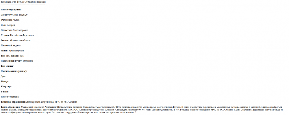 Уважаемый Владимир Андреевич! Позвольте мне выразить благодарность сотрудниками МЧС за помощь, оказанную мне во время моего отдыха в Грузии. В связи с закрытием перевала, я с малолетними детьми, оказался в западне без шансов выбраться своими силами. Благодаря оперативным действиям сотрудников МЧС РСО-Алания по руководством Хоружия Александра Николаевича, мы были успешно доставлены в РФ. Большое спасибо сотруднику МЧС по РСО-Алании Юлии Старченко, державшей руку на пульсе от момента обращения до завершения нашего пути. Без помощи сотрудников Министерства, наш отдых мог превратиться в кошмар.
