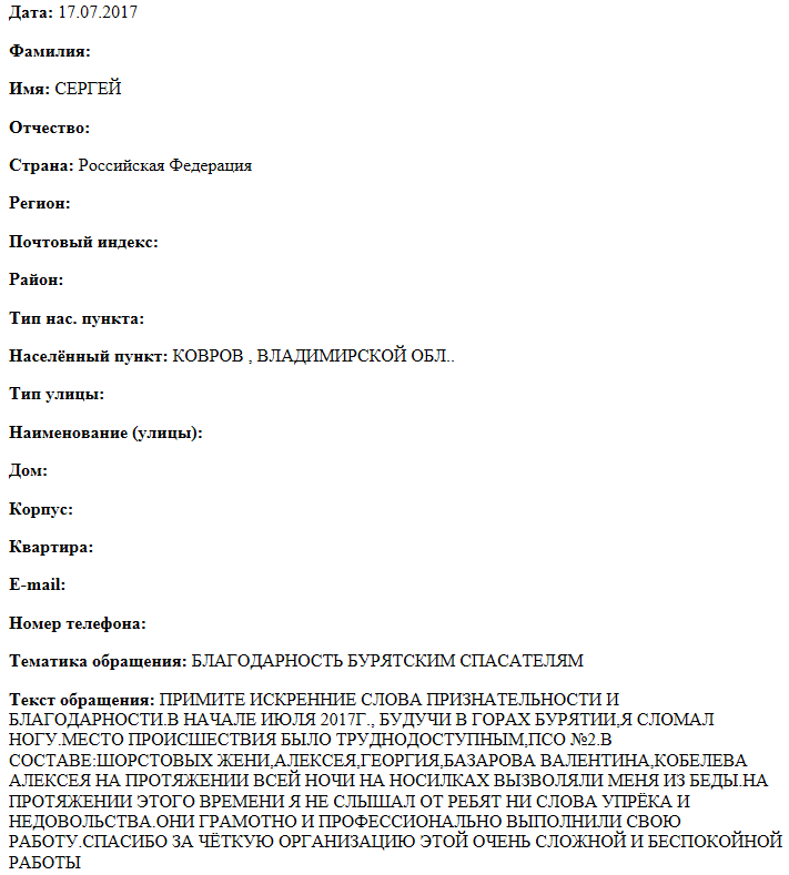 Примите искренние слова признательности и благодарности. В начале июля 2017г., будучи в горах Бурятии я сломал ногу, место происшествия было труднодоступным и ПСО №2 в составе: Шорстовых Жени, Алексея, Георгия, Базарова Валентина, Кобелева Алексея, на протяжении всей ночи на носилках вызволяли меня из беды. На протяжении этого времени я не слышал от ребят ни слова упрёка и недовольства, они грамотно и профессионально выполнили свою работу. Спасибо за чёткую организацию этой очень сложной и беспокойной работы.