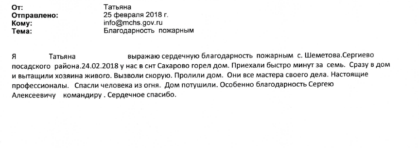 Благодарность пожарным с. Шеметова за спасение человека из огня