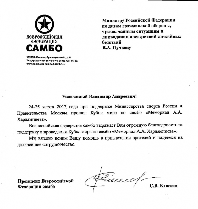 Всероссийская федерация самбо выражает Вам огромную благодарность за поддержку в проведении Кубка мира по самбо "Мемориал А.А. Харлампиева".