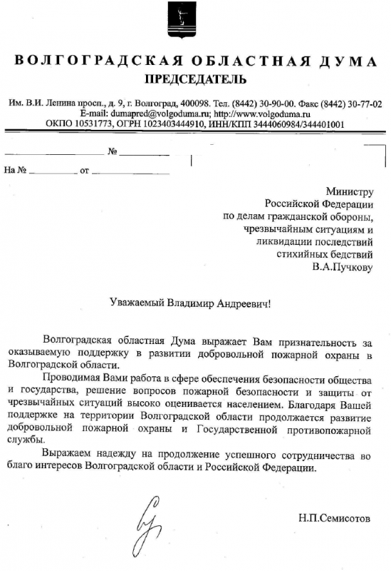 Волгоградская областная Дума выражает Вам признательность за оказываемую поддержку в развитии добровольной пожарной охраны в Волгоградской области.