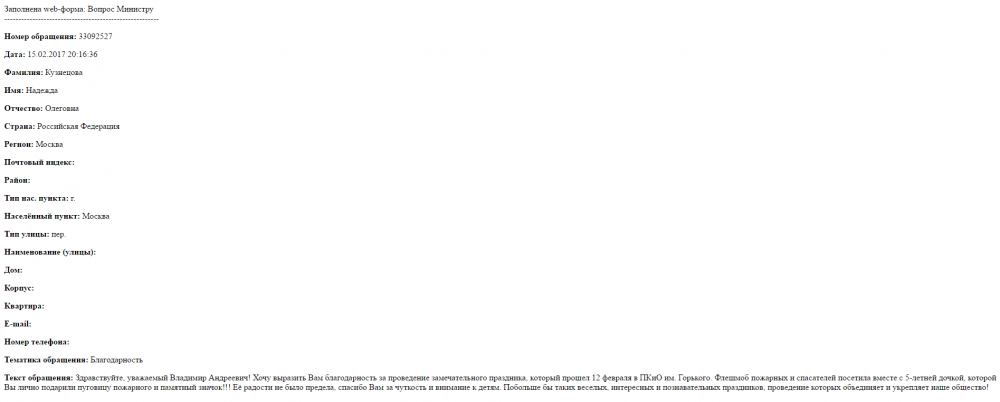 Здравствуйте, уважаемый Владимир Андреевич! Хочу выразить Вам благодарность за проведение замечательного праздника, который прошел 12 февраля в ПКиО им. Горького. Флешмоб пожарных и спасателей посетила вместе с 5-летней дочкой, которой Вы лично подарили пуговицу пожарного и памятный значок!!! Её радости не было предела, спасибо Вам за чуткость и внимание к детям. Побольше бы таких веселых, интересных и познавательных праздников, проведение которых объединяет и укрепляет наше общество!