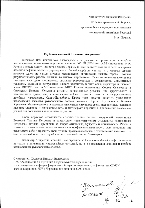 Благодарность сотрудникам МЧС России за организацию и подбор персонала клиники №2 ВЦЭРМ г. Санкт-Петербург