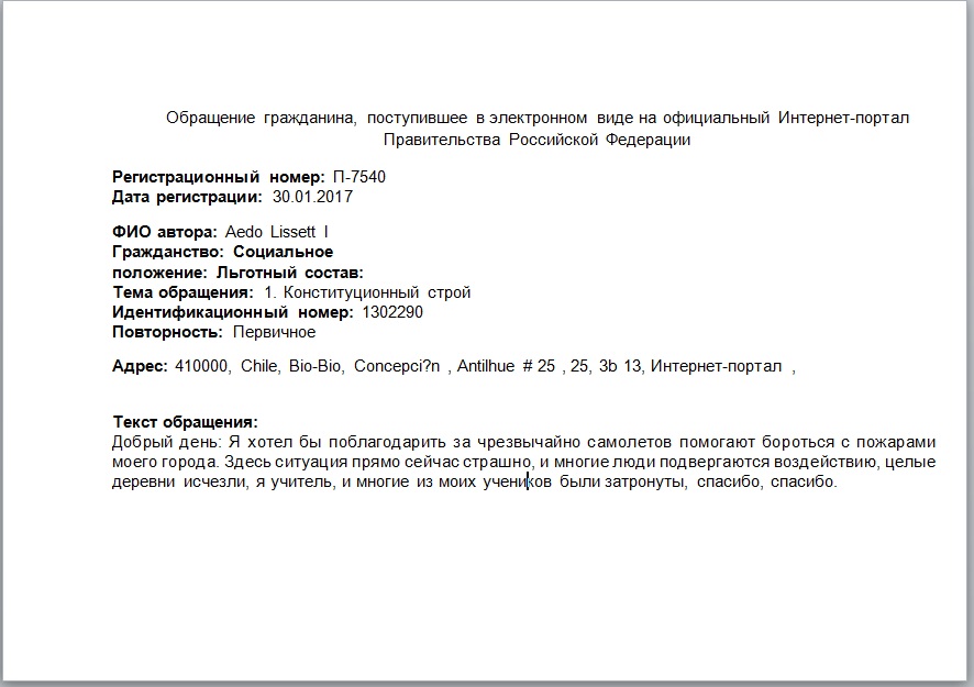 Благодарность от жителя Чили пилотам авиации МЧС России за помощь в тушении пожаров