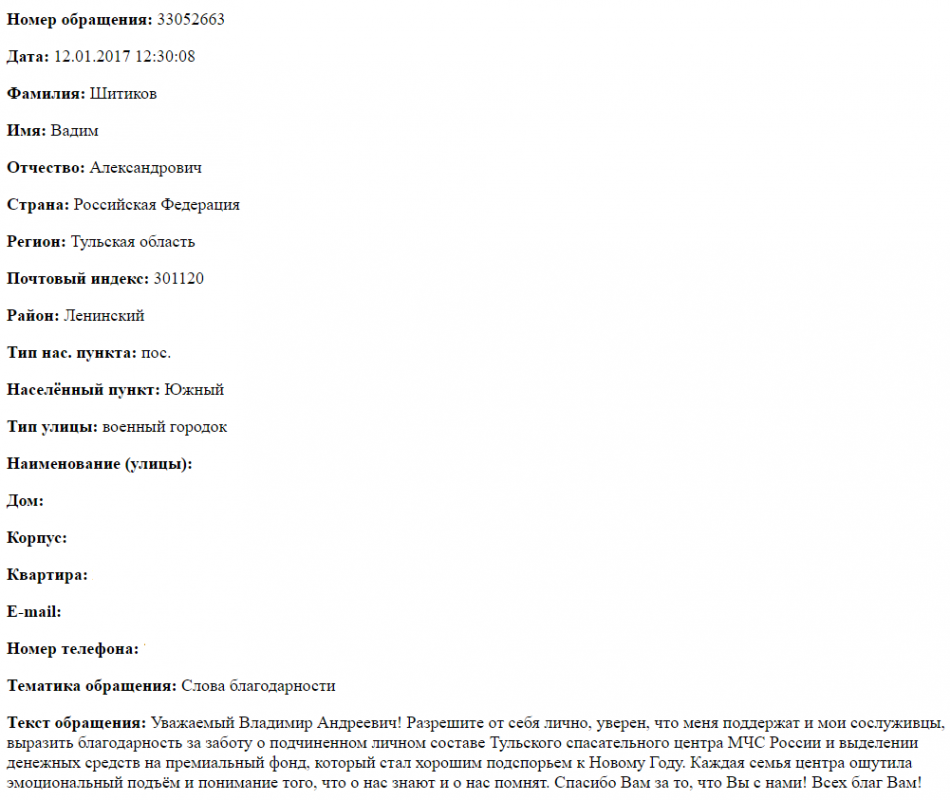 Уважаемый Владимир Андреевич! Разрешите от себя лично, уверен, что меня поддержат и мои сослуживцы, выразить благодарность за заботу о подчиненном личном составе Тульского спасательного центра МЧС России и выделении денежных средств на премиальный фонд, который стал хорошим подспорьем к Новому Году. Каждая семья центра ощутила эмоциональный подъём и понимание того, что о нас знают и о нас помнят. Спасибо Вам за то, что Вы с нами! Всех благ Вам!