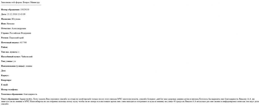 Хотелось бы выразить еще благодарность Янькову А.А. не знаю, кто он по званию в МЧС Новосибирска, но он отправил помощь моему мужу чтобы он не замерз.