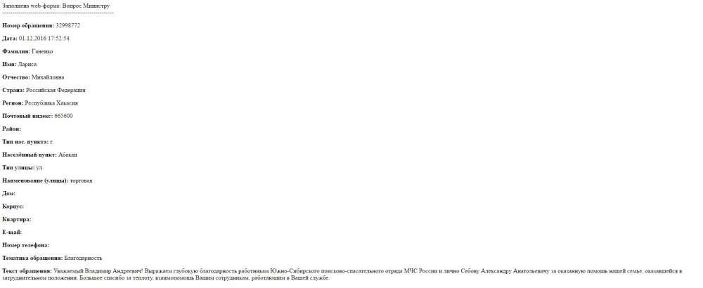 Выражаем глубокую благодарность работникам Южно-Сибирского поисково-спасательного отряда МЧС России и лично Себову Александру Анатольевичу за оказанную помощь нашей семье, оказавшейся в затруднительном положении.