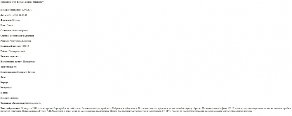 Прошу Вас поощрить руководство и сотрудников ГУ МЧС России по Республике Карелия, которые оказали мне всестороннюю помощь.