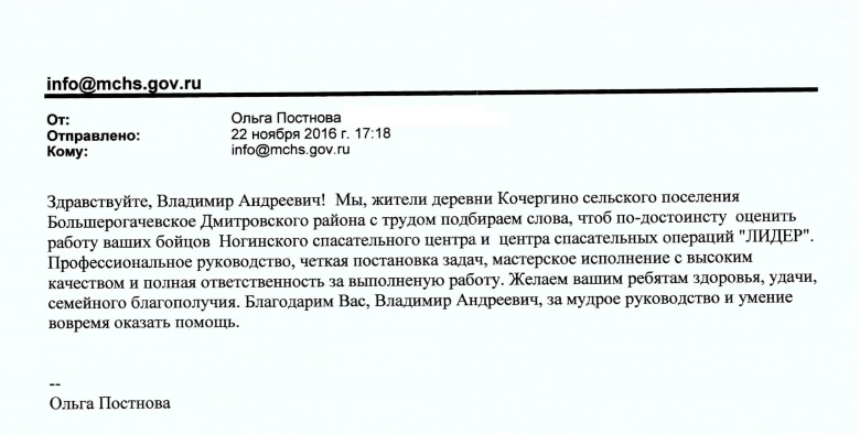 Мы, жители деревни Кочергино сельского поселения Большерогаческое Дмитровского района с трудом подбираем слова, чтоб по-достоинству оценить работу ваших бойцов Ногинского спасательного центра и центра спасательных операций «ЛИДЕР». Профессиональное руководство, четкая постановка задач, мастерское исполнение с высоким качеством и полная ответственность за выполненную работу. Желаем вашим ребятам здоровья, удачи, семейного благополучия. Благодарим Вас, Владимир Андреевич, за мудрое руководство и умение вовремя оказать помощь.