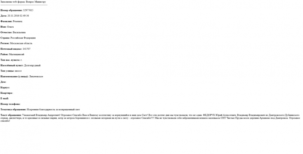 Огромное Спасибо Вам и Вашему коллективу за вернувшийся в наш дом свет! Все эти долгие дни мы чувствовали, что не одни. ФЕДОРУК Юрий Алексеевич, Владимир Владимирович из Дмитровского/Дубнинского отряда, диспетчера, и те красивые и сильные парни, метр за метром боровшиеся с лесными заторами на пути к свету - огромное спасибо!!!!