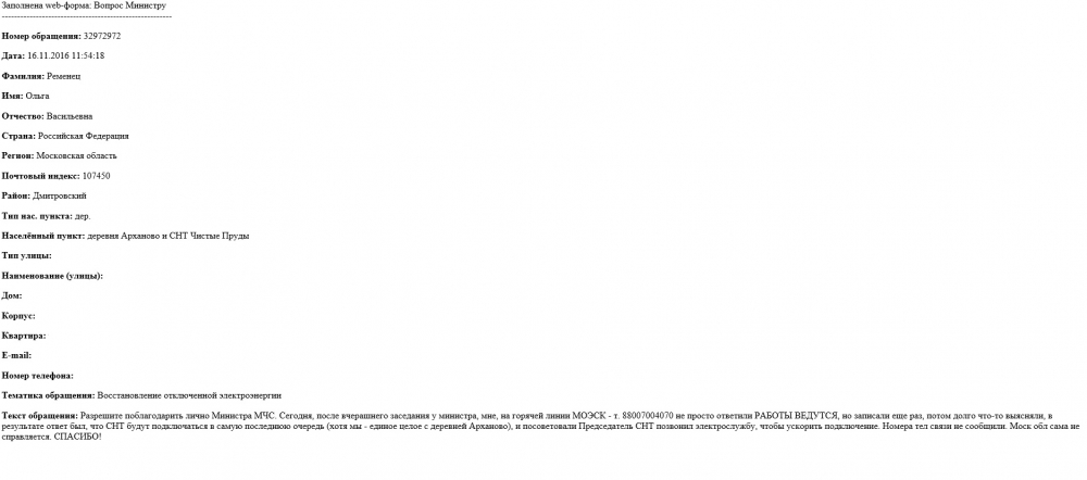 Сегодня, после вчерашнего заседания у министра, мне, на горячей линии МОЭСК - т. 88007004070 не просто ответили РАБОТЫ ВЕДУТСЯ, но записали еще раз, потом долго что-то выясняли, в результате ответ был, что СНТ будут подключаться в самую последнюю очередь (хотя мы - единое целое с деревней Арханово), и посоветовали Председатель СНТ позвонил в электрослужбу, чтобы ускорить подключение. Номера тел связи не сообщили. Моск обл сама не справляется.