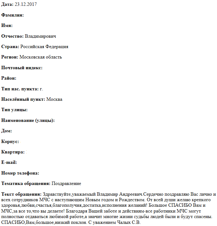 Здравствуйте, уважаемый Владимир Андреевич. Сердечно поздравляю Вас лично и всех сотрудников МЧС с наступающим Новым годом и Рождеством. От всей души желаю крепкого здоровья,любви,счастья,благополучия,достатка,исполнения желаний! Большое СПАСИБО Вам и МЧС, за все то, что вы делаете! Благодаря Вашей заботе и действиям-все работники МЧС могут полностью отдаваться любимой работе, а значит многие жизни судьбы людей были и будут спасены. СПАСИБО Вам большое, низкий поклон. С уважением Чалых С.В.