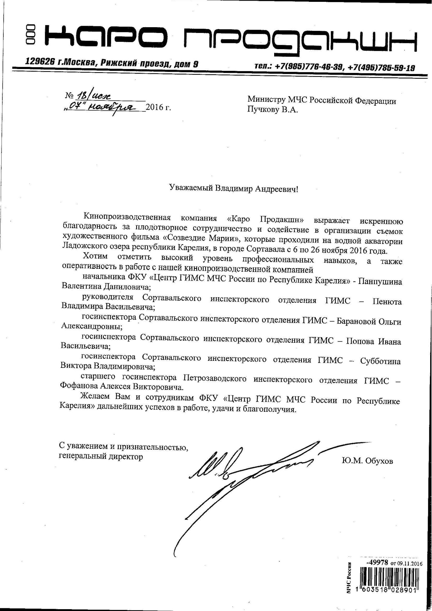 Благодарность сотрудникам МЧС России от кинопроизводственной компании "Каро Продакшн"