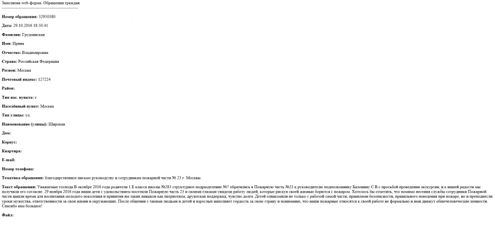 В октябре 2016 года родители 1 "Е" класса школы №283 структурное подразделение №7 обратились в Пожарную часть №23 к руководителю подполковнику Балонину С.В.с просьбой проведения экскурсии, и к нашей радости мы получили его согласие. 29 ноября 2016 года наши дети с удовольствием посетили Пожарную часть №23 и своими глазами увидели работу людей, которые рискуя своей жизнью борются с пожаром. Хотелось бы отметить, что помимо несения службы сотрудники Пожарной части нашли время для воспитания молодого поколения и привития им таких навыков как патриотизм, дружеская поддержка, чувство долга. Детей ознакомили не только с работой самой части, правилами безопасности, правильного поведения при пожаре, но и преподнесли уроки мужества, ответственности за свои жизни и окружающих. После общения с такими людьми и детей и взрослых наполняет гордость за свою страну и понимание, что наши пожарные относятся к своей работе не формально и ими движут общечеловеческие ценности.