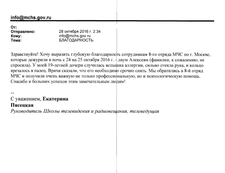 Хочу выразить глубокую благодарность сотрудникам 8-го отряда МЧС России по г. Москве, которые дежурили в ночь с 24 на 25 октября 2016 г. - двум Алексеям (фамилии, к сожалению, не спросила). У моей 19-летней дчери случилась вспышка аллергии, сильно отекла рука, и кольцо врезалось в палец. Врачи сказали, что его необходимо срочно снять. Мы обратились в 8-й отряд МЧС России и получили очень важную не только профессиональную, но и психологическую помощь.