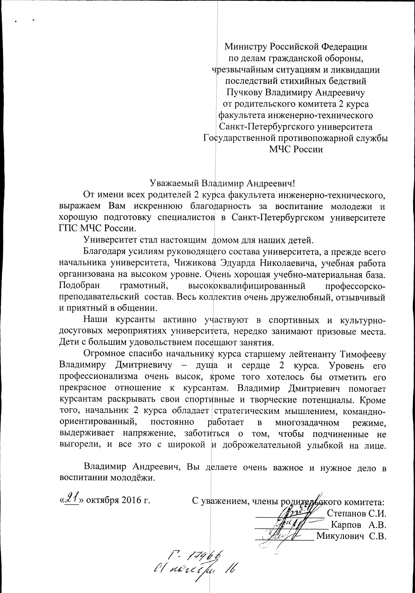 Благодарность Министру Владимиру Пучкову от родительского комитета Санкт-Петербургского университета Государственной противопожарной службы МЧС России