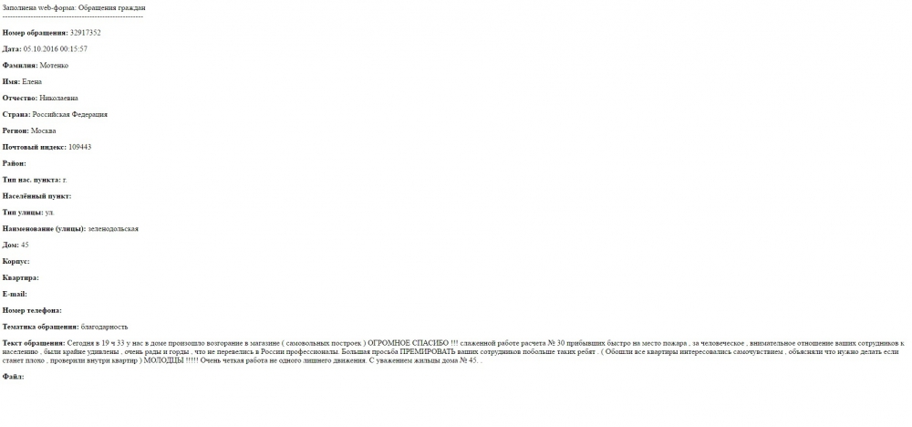 ОГРОМНОЕ СПАСИБО за слаженную работу расчета № 30 прибывших быстро на место пожара. За человеческое, внимательное отношение ваших сотрудников к населению. Были крайне удивлены, очень рады и горды, что не перевелись в России профессионалы. Большая просьба ПРЕМИРОВАТЬ ваших сотрудников, побольше таких ребят. (Обошли все квартиры интересовались самочувствием, объясняли, что нужно делать если станет плохо, проверили внутри квартир ) МОЛОДЦЫ !!!!! Очень четкая работа не одного лишнего движения.